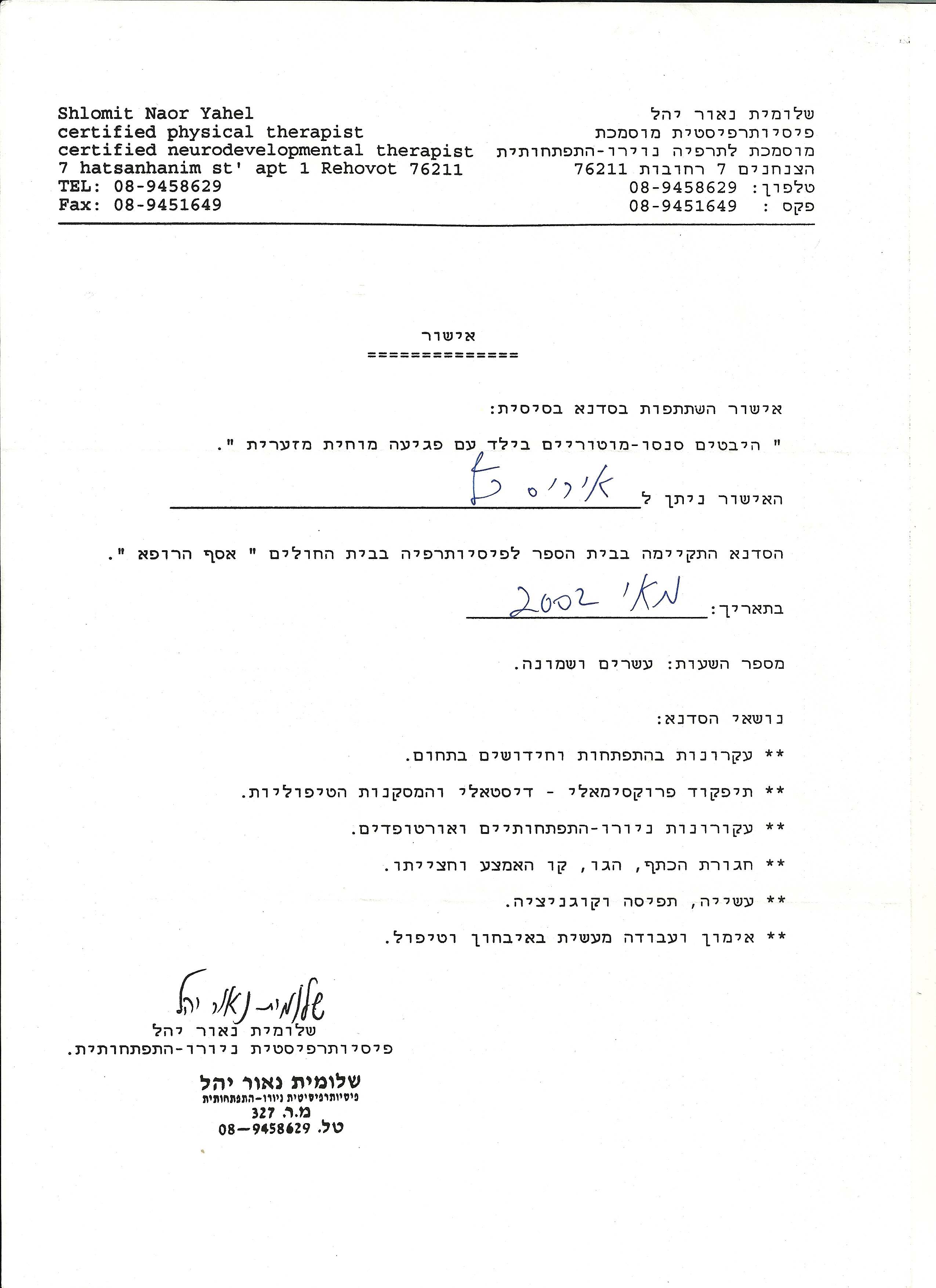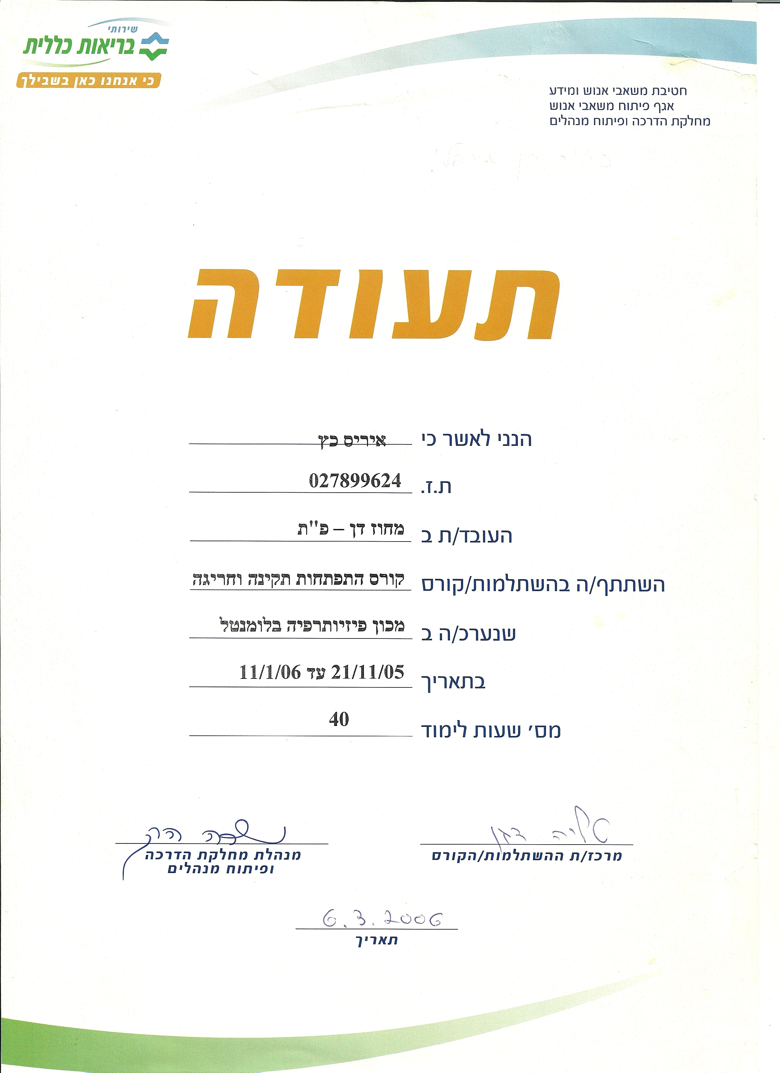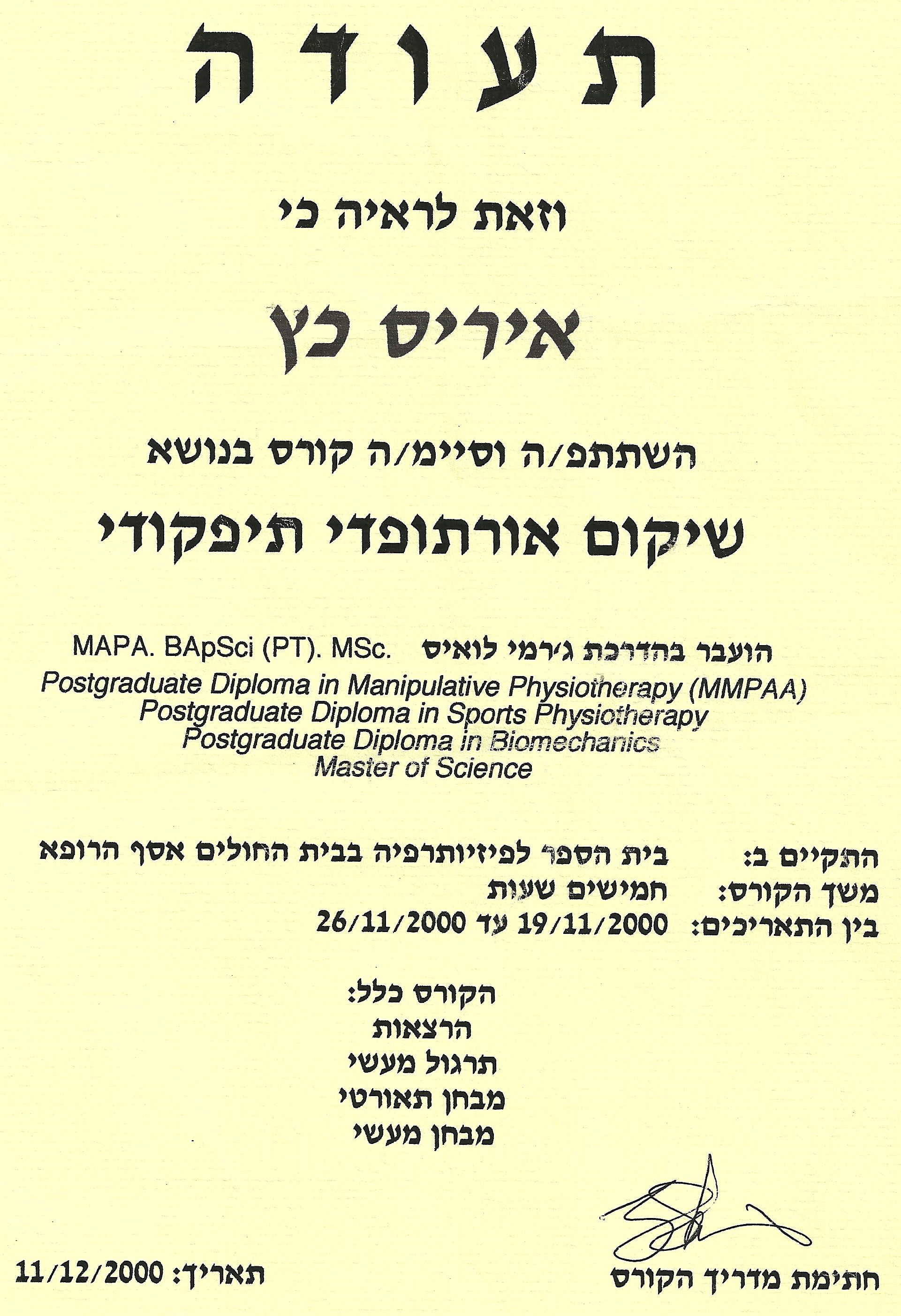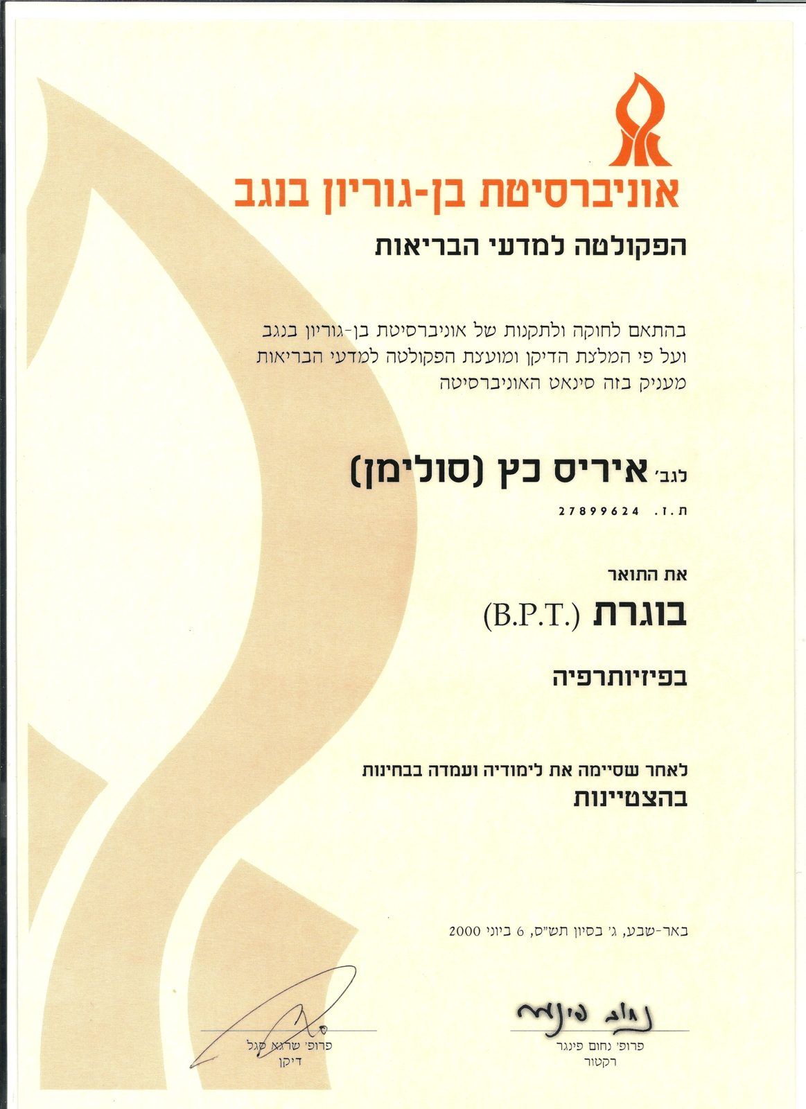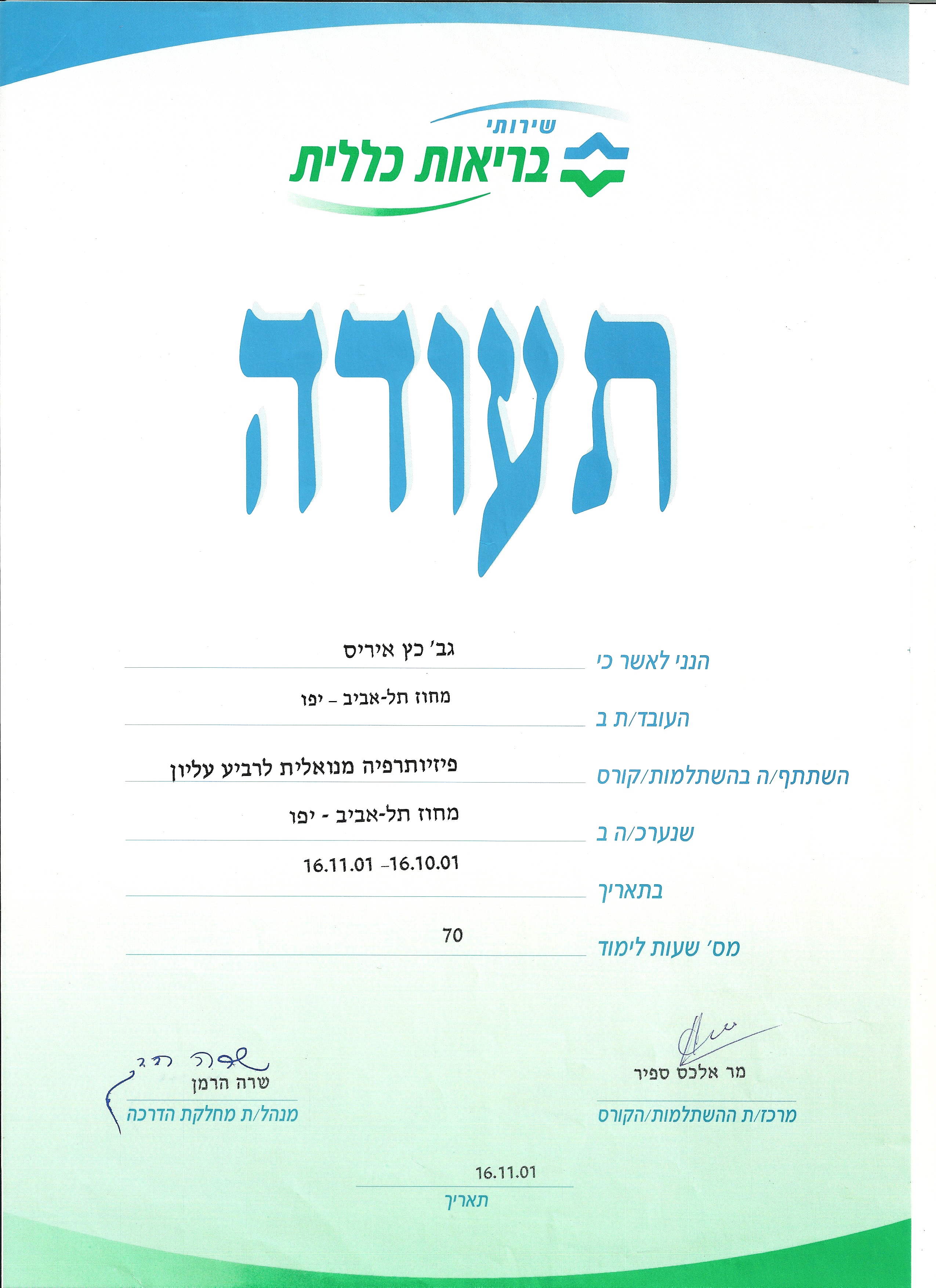 - תעודת פיזיותרפיסט מוסמך ברישיון ממשרד הבריאות
