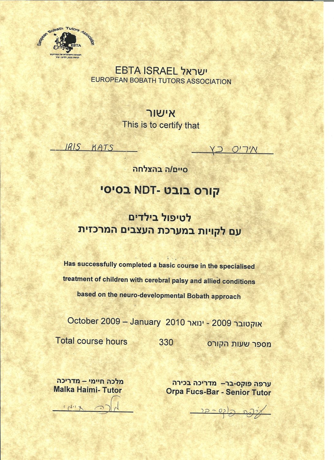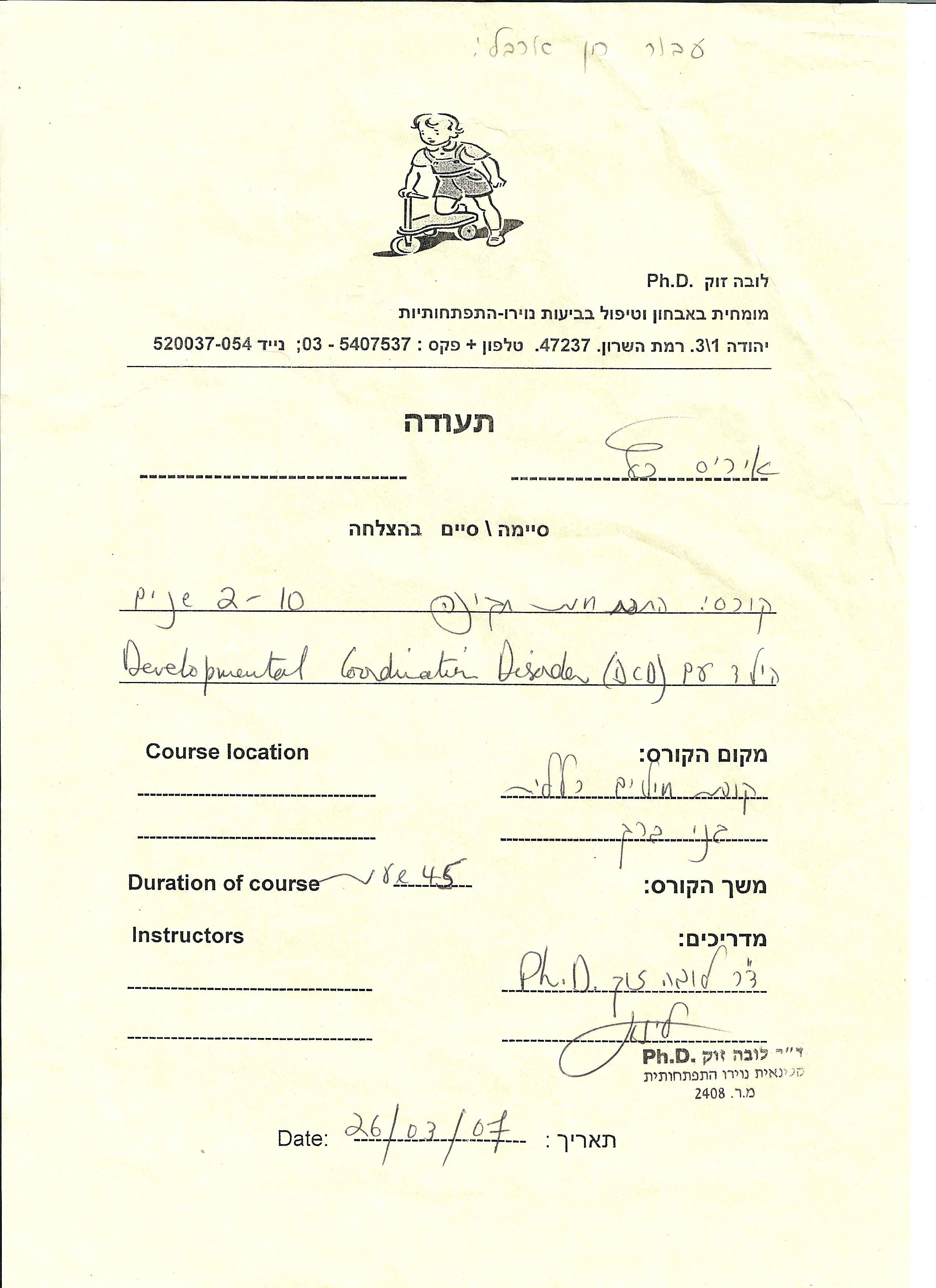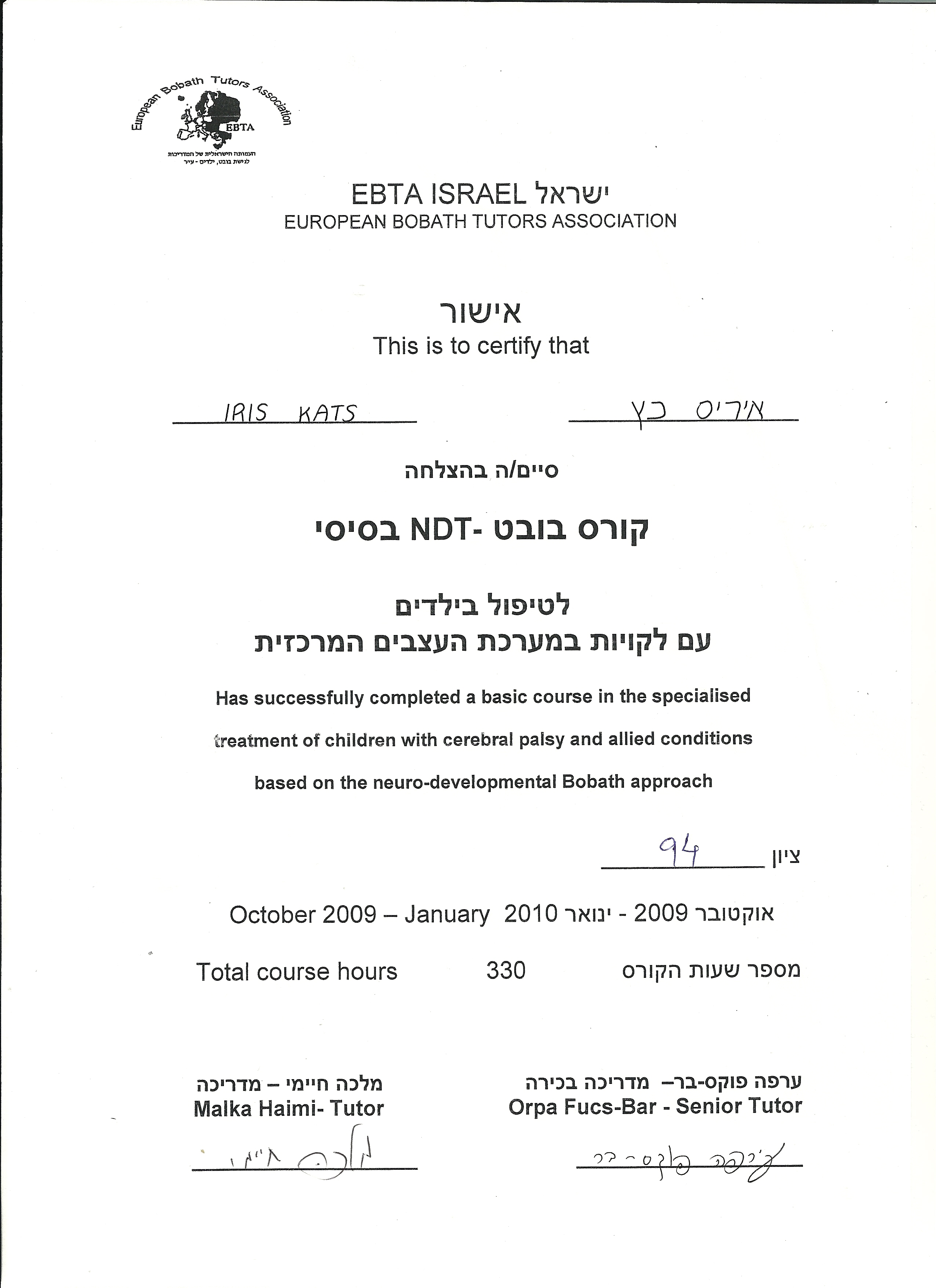 - קורס בובט 330 שעות לטיפול בילדים עם לקויות במערכת העצבים המרכזית סיום בציון 94