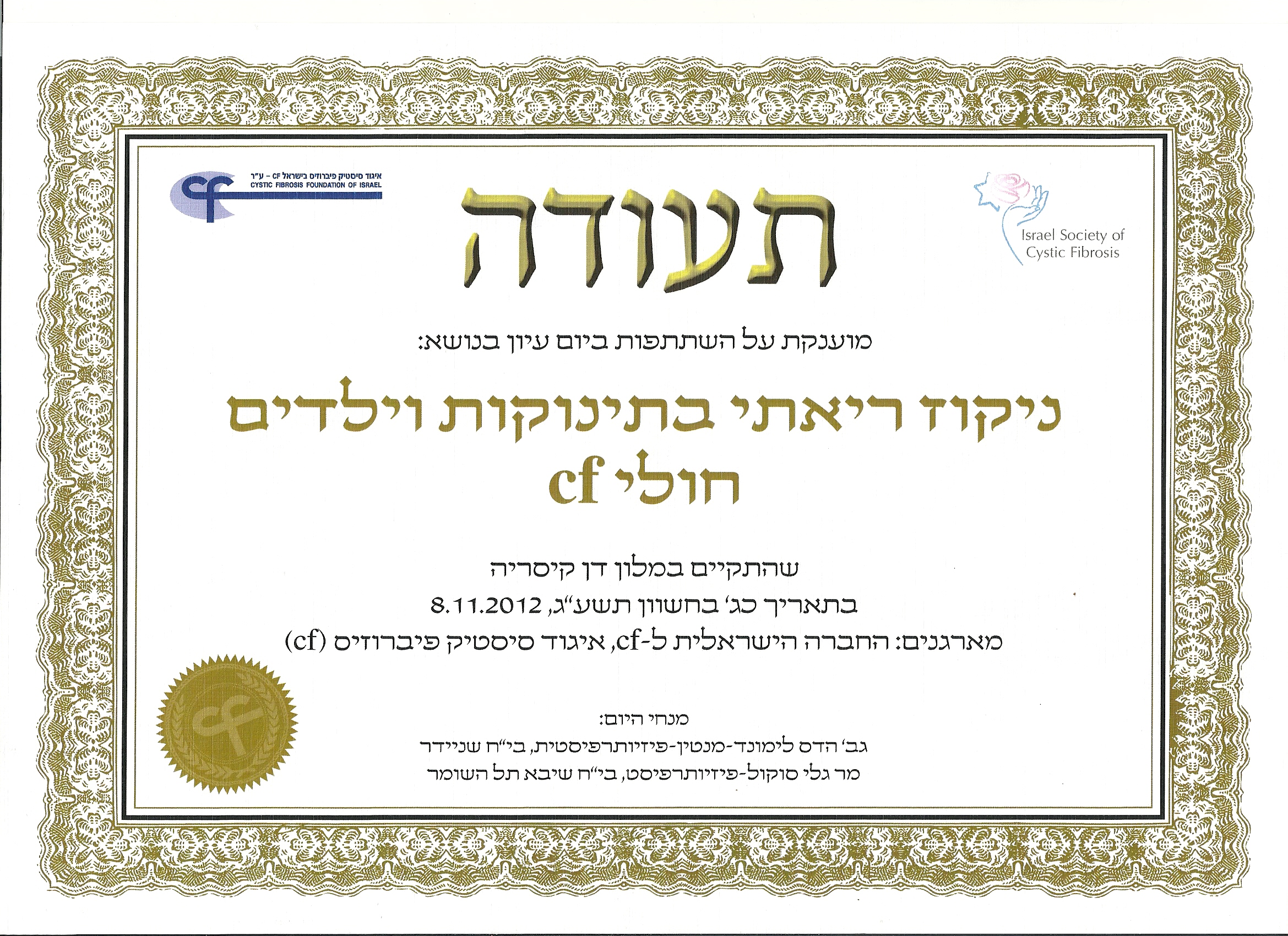 - תעודת בוגרת מצטיינת בפיזיותרפיה מאוניברסיטת בן גוריון
